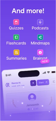 Med Raena AI får du tilgang til et mangfold av innovative funksjoner som skreddersyr læringsopplevelsen. Konverter enkelt notatene dine til interaktive quizer – enten som flervalgsoppgaver eller korte svar – med vår AI-quizgenerator. Få oversikt med krystallklare "Smart Summaries" som koker ned komplekst stoff til lettfordøyelig essens. For dem som foretrekker å lære på farten, forvandler Raena AI studienotatene dine til podkaster, slik at du kan lære håndfritt. Repeter essensielle fakta med digitale studiekort, eller dykk dypere med din personlige AI-veileder som tilpasser seg dine spørsmål og stil. Og for en helt ny dimensjon av læring, la "Brainrot" gjøre notatene dine om til engasjerende TikTok-lignende videoer med undertekster og populært spillinnhold – en morsom og visuelt stimulerende måte å fordype seg i stoffet på. Vær oppmerksom på at enkelte av disse avanserte funksjonene krever et kjøp.